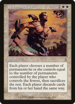 Each player chooses a number of permanents they control equal to the number of permanents controlled by the player who controls the fewest, then sacrifices the rest. Each player discards cards the same way.