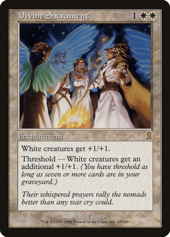 White creatures get +1/+1. Threshold — White creatures get an additional +1/+1 as long as seven or more cards are in your graveyard.