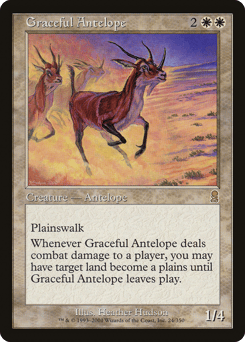 Plainswalk (This creature can't be blocked as long as defending player controls a Plains.) Whenever this creature deals combat damage to a player, you may have target land become a Plains until this creature leaves the battlefield.