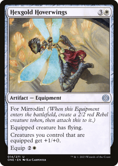 For Mirrodin! (When this Equipment enters, create a 2/2 red Rebel creature token, then attach this to it.) Equipped creature has flying. Creatures you control that are equipped get +1/+0. Equip {2}{W}