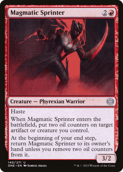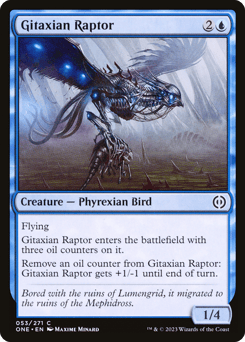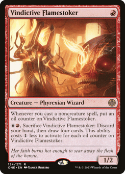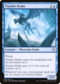 Flying This creature enters with an oil counter on it. This creature gets +1/+1 for each oil counter on it. Whenever you cast a noncreature spell, put an oil counter on this creature.