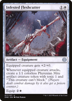 Equipped creature gets +2/+0. Whenever equipped creature attacks, create a 1/1 colorless Phyrexian Mite artifact creature token with toxic 1 and "This token can't block." (Players dealt combat damage by it also get a poison counter.) Equip {2}{W}