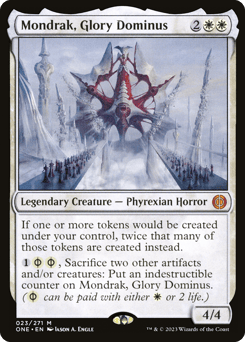 If one or more tokens would be created under your control, twice that many of those tokens are created instead. {1}{W/P}{W/P}, Sacrifice two other artifacts and/or creatures: Put an indestructible counter on Mondrak. ({W/P} can be paid with either {W} or 2 life.)