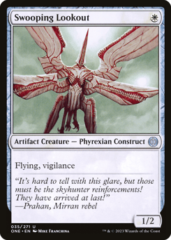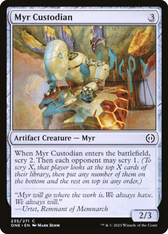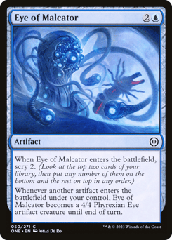 When this artifact enters, scry 2. (Look at the top two cards of your library, then put any number of them on the bottom and the rest on top in any order.) Whenever another artifact you control enters, this artifact becomes a 4/4 Phyrexian Eye artifact creature until end of turn.