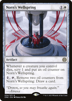 Whenever a creature you control dies, scry 1 and put an oil counter on this artifact. {1}, {T}, Remove two oil counters from this artifact: Draw a card.
