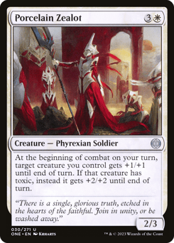At the beginning of combat on your turn, target creature you control gets +1/+1 until end of turn. If that creature has toxic, instead it gets +2/+2 until end of turn.