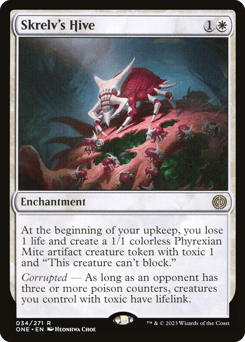 At the beginning of your upkeep, you lose 1 life and create a 1/1 colorless Phyrexian Mite artifact creature token with toxic 1 and "This token can't block." Corrupted — As long as an opponent has three or more poison counters, creatures you control with toxic have lifelink.