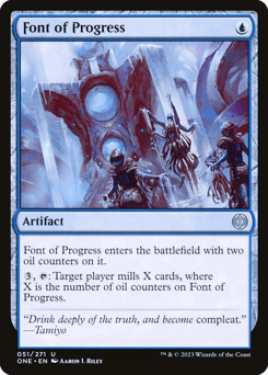 This artifact enters with two oil counters on it. {3}, {T}: Target player mills X cards, where X is the number of oil counters on this artifact.