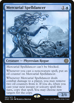 This creature can't be blocked. Whenever you cast a noncreature spell, put an oil counter on this creature. Whenever this creature deals combat damage to a player, you may remove two oil counters from it. If you do, when you next cast an instant or sorcery spell this turn, copy that spell. You may choose new targets for the copy.