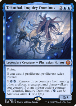 Flying If you would proliferate, proliferate twice instead. {1}{U/P}{U/P}, Remove three counters from among other artifacts, creatures, and planeswalkers you control: Put an indestructible counter on Tekuthal. ({U/P} can be paid with either {U} or 2 life.)