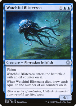 Flying This creature enters with an oil counter on it. When this creature dies, draw cards equal to the number of oil counters on it.