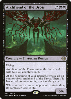 Flying This creature enters with four oil counters on it. At the beginning of your upkeep, remove an oil counter from this creature. Then if it has no oil counters on it, you lose the game. Whenever a creature an opponent controls dies, its controller loses 2 life.