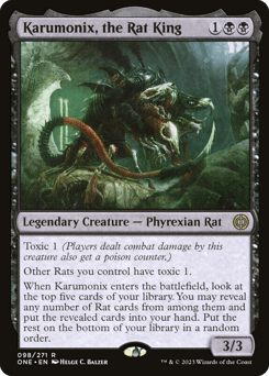 Toxic 1 (Players dealt combat damage by this creature also get a poison counter.) Other Rats you control have toxic 1. When Karumonix enters, look at the top five cards of your library. You may reveal any number of Rat cards from among them and put the revealed cards into your hand. Put the rest on the bottom of your library in a random order.