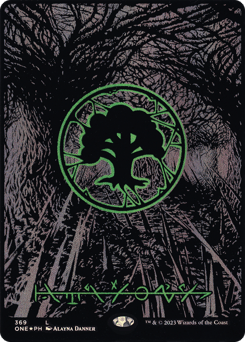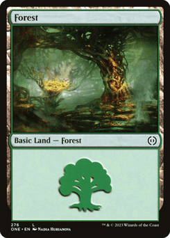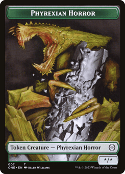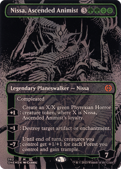 Compleated ({G/P} can be paid with {G} or 2 life. For each {G/P} paid with life, this planeswalker enters with two fewer loyalty counters.) [+1]: Create an X/X green Phyrexian Horror creature token, where X is Nissa's loyalty. [−1]: Destroy target artifact or enchantment. [−7]: Until end of turn, creatures you control get +1/+1 for each Forest you control and gain trample.