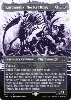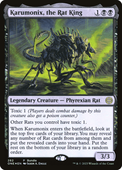 Toxic 1 (Players dealt combat damage by this creature also get a poison counter.) Other Rats you control have toxic 1. When Karumonix enters, look at the top five cards of your library. You may reveal any number of Rat cards from among them and put the revealed cards into your hand. Put the rest on the bottom of your library in a random order.