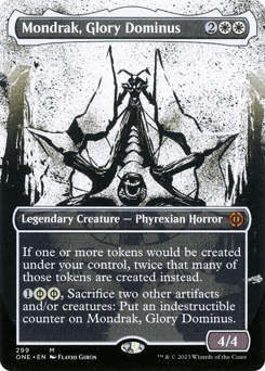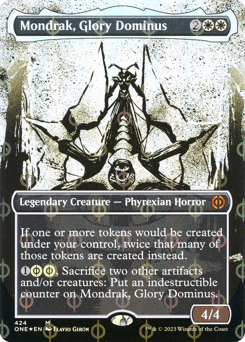 If one or more tokens would be created under your control, twice that many of those tokens are created instead. {1}{W/P}{W/P}, Sacrifice two other artifacts and/or creatures: Put an indestructible counter on Mondrak. ({W/P} can be paid with either {W} or 2 life.)