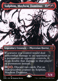 If a source you control would deal noncombat damage to an opponent or a permanent an opponent controls, it deals double that damage to that player or permanent instead. {1}{R/P}{R/P}, Discard two cards: Put an indestructible counter on Solphim. ({R/P} can be paid with either {R} or 2 life.)