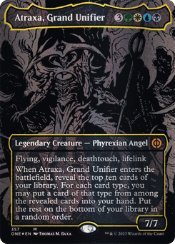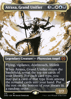 Flying, vigilance, deathtouch, lifelink When Atraxa enters, reveal the top ten cards of your library. For each card type, you may put a card of that type from among the revealed cards into your hand. Put the rest on the bottom of your library in a random order. (Artifact, battle, creature, enchantment, instant, land, planeswalker, and sorcery are card types.)