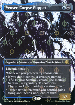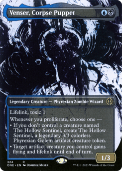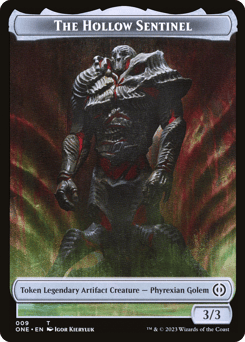 Lifelink, toxic 1 Whenever you proliferate, choose one — • If you don't control a creature named The Hollow Sentinel, create The Hollow Sentinel, a legendary 3/3 colorless Phyrexian Golem artifact creature token. • Target artifact creature you control gains flying and lifelink until end of turn.