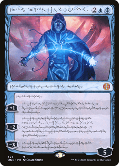 Compleated ({U/P} can be paid with {U} or 2 life. If life was paid, this planeswalker enters with two fewer loyalty counters.) [+1]: Until your next turn, up to one target creature gets -3/-0. [−2]: Target player mills three cards. Then if a graveyard has twenty or more cards in it, you draw three cards. Otherwise, you draw a card. [−X]: Target player mills three times X cards.