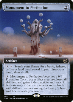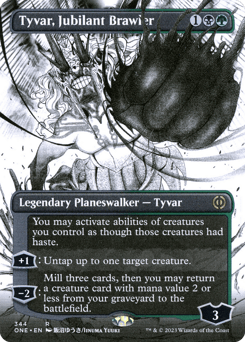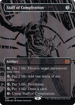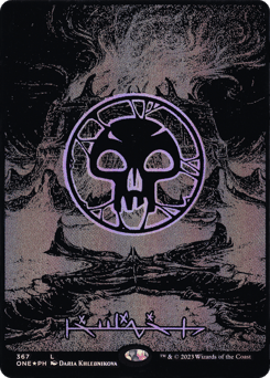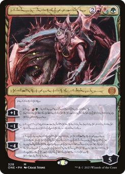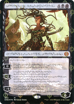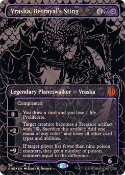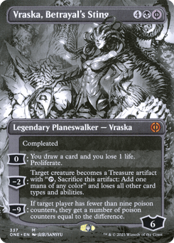 Compleated ({B/P} can be paid with {B} or 2 life. If life was paid, this planeswalker enters with two fewer loyalty counters.) [0]: You draw a card and you lose 1 life. Proliferate. [−2]: Target creature becomes a Treasure artifact with "{T}, Sacrifice this artifact: Add one mana of any color" and loses all other card types and abilities. [−9]: If target player has fewer than nine poison counters, they get a number of poison counters equal to the difference.