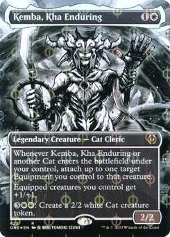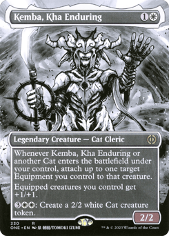 Whenever Kemba or another Cat you control enters, attach up to one target Equipment you control to that creature. Equipped creatures you control get +1/+1. {3}{W}{W}: Create a 2/2 white Cat creature token.