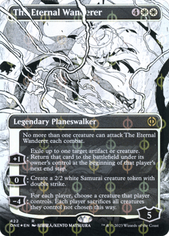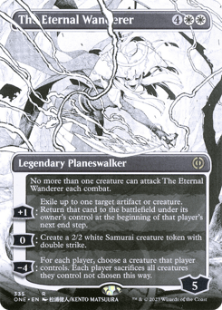 No more than one creature can attack The Eternal Wanderer each combat. [+1]: Exile up to one target artifact or creature. Return that card to the battlefield under its owner's control at the beginning of that player's next end step. [0]: Create a 2/2 white Samurai creature token with double strike. [−4]: For each player, choose a creature that player controls. Each player sacrifices all creatures they control not chosen this way.
