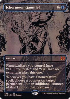 Planeswalkers you control have "[0]: Proliferate" and "[−12]: Take an extra turn after this one." Whenever you cast a noncreature spell, choose a counter on target permanent. Put an additional counter of that kind on that permanent.