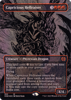 This spell costs {3} less to cast if you have nine or more cards in your graveyard. Flying When this creature enters, exile three cards at random from your graveyard. Choose a noncreature, nonland card from among them and copy it. You may cast the copy without paying its mana cost.