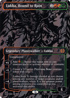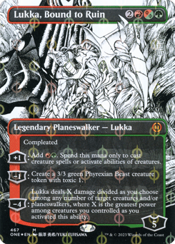 Compleated ({R/G/P} can be paid with {R}, {G}, or 2 life. If life was paid, this planeswalker enters with two fewer loyalty counters.) [+1]: Add {R}{G}. Spend this mana only to cast creature spells or activate abilities of creatures. [−1]: Create a 3/3 green Phyrexian Beast creature token with toxic 1. [−4]: Lukka deals X damage divided as you choose among any number of target creatures and/or planeswalkers, where X is the greatest power among creatures you control as you activate this ability.
