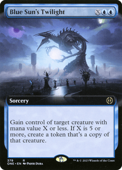 Gain control of target creature with mana value X or less. If X is 5 or more, create a token that's a copy of that creature.