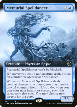 This creature can't be blocked. Whenever you cast a noncreature spell, put an oil counter on this creature. Whenever this creature deals combat damage to a player, you may remove two oil counters from it. If you do, when you next cast an instant or sorcery spell this turn, copy that spell. You may choose new targets for the copy.