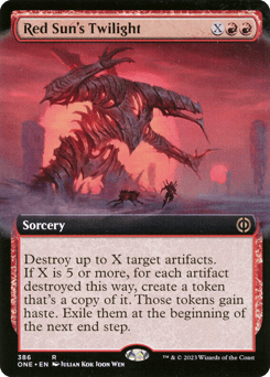 Destroy up to X target artifacts. If X is 5 or more, for each artifact destroyed this way, create a token that's a copy of it. Those tokens gain haste. Exile them at the beginning of the next end step.