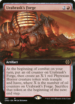 At the beginning of combat on your turn, put an oil counter on this artifact, then create an X/1 red Phyrexian Horror creature token with trample and haste, where X is the number of oil counters on this artifact. Sacrifice that token at the beginning of the next end step.