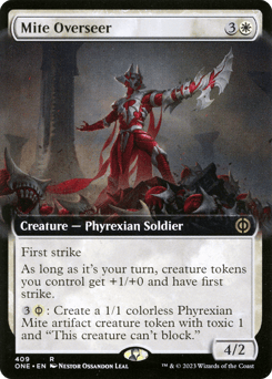 Battle cry (Whenever this creature attacks, each other attacking creature gets +1/+0 until end of turn.) At the beginning of combat on your turn, the next time target creature would deal combat damage to one or more players this combat, prevent that damage. If damage is prevented this way, create that many 1/1 colorless Phyrexian Mite artifact creature tokens with toxic 1 and "This token can't block."