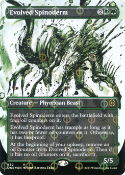 This creature enters with four oil counters on it. This creature has trample as long as it has two or fewer oil counters on it. Otherwise, it has hexproof. At the beginning of your upkeep, remove an oil counter from this creature. Then if it has no oil counters on it, sacrifice it.