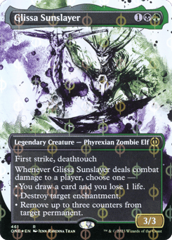 First strike, deathtouch Whenever Glissa Sunslayer deals combat damage to a player, choose one — • You draw a card and you lose 1 life. • Destroy target enchantment. • Remove up to three counters from target permanent.
