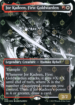 Trample Whenever Jor Kadeen attacks, it gets +X/+X until end of turn, where X is the number of equipped creatures you control. Then if Jor Kadeen's power is 4 or greater, draw a card.