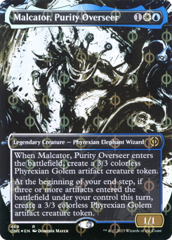 When Malcator enters, create a 3/3 colorless Phyrexian Golem artifact creature token. At the beginning of your end step, if three or more artifacts entered the battlefield under your control this turn, create a 3/3 colorless Phyrexian Golem artifact creature token.