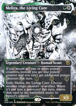 If you would get one or more poison counters, instead you get one poison counter and you can't get additional poison counters this turn. Exile Melira: Choose another target creature or artifact. When it's put into a graveyard this turn, return that card to the battlefield under its owner's control.
