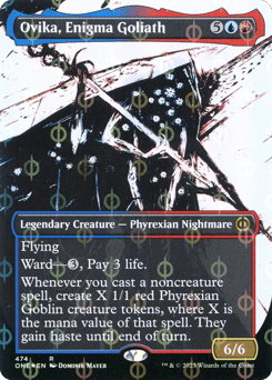 Flying Ward—{3}, Pay 3 life. Whenever you cast a noncreature spell, create X 1/1 red Phyrexian Goblin creature tokens, where X is the mana value of that spell. They gain haste until end of turn.