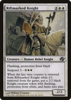 Protection from black; flanking (Whenever a creature without flanking blocks this creature, the blocking creature gets -1/-1 until end of turn.) Suspend 3—{1}{W}{W} When the last time counter is removed from this card while it's exiled, create a 2/2 black Knight creature token with flanking, protection from white, and haste.