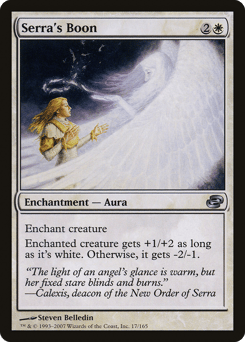 Enchant creature Enchanted creature gets +1/+2 as long as it's white. Otherwise, it gets -2/-1.