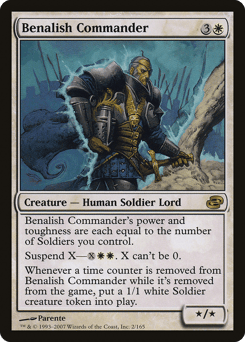 Benalish Commander's power and toughness are each equal to the number of Soldiers you control. Suspend X—{X}{W}{W}. X can't be 0. Whenever a time counter is removed from this card while it's exiled, create a 1/1 white Soldier creature token.