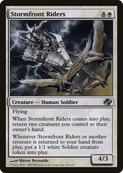 Flying When this creature enters, return two creatures you control to their owner's hand. Whenever this creature or another creature is returned to your hand from the battlefield, create a 1/1 white Soldier creature token.