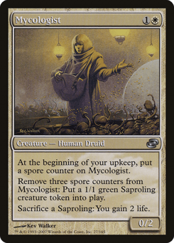 At the beginning of your upkeep, put a spore counter on this creature. Remove three spore counters from this creature: Create a 1/1 green Saproling creature token. Sacrifice a Saproling: You gain 2 life.