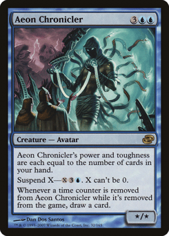 Aeon Chronicler's power and toughness are each equal to the number of cards in your hand. Suspend X—{X}{3}{U}. X can't be 0. Whenever a time counter is removed from this card while it's exiled, draw a card.
