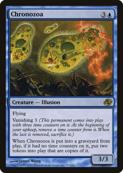 Flying Vanishing 3 (This creature enters with three time counters on it. At the beginning of your upkeep, remove a time counter from it. When the last is removed, sacrifice it.) When this creature dies, if it had no time counters on it, create two tokens that are copies of it.