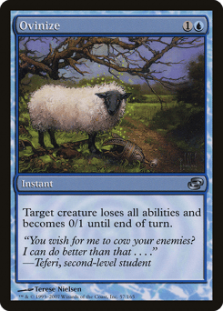 Until end of turn, target creature loses all abilities and has base power and toughness 0/1.