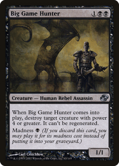 When this creature enters, destroy target creature with power 4 or greater. It can't be regenerated. Madness {B} (If you discard this card, discard it into exile. When you do, cast it for its madness cost or put it into your graveyard.)